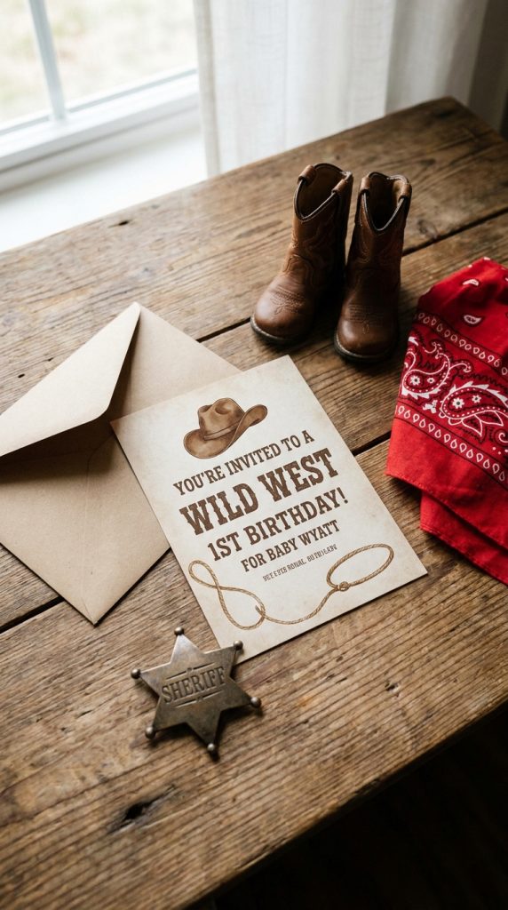 Choose an invitation design featuring rustic wood textures, cowboy boots, sheriff stars, or bandana patterns. These small visual details immediately signal “Western roundup” without any explanation needed.