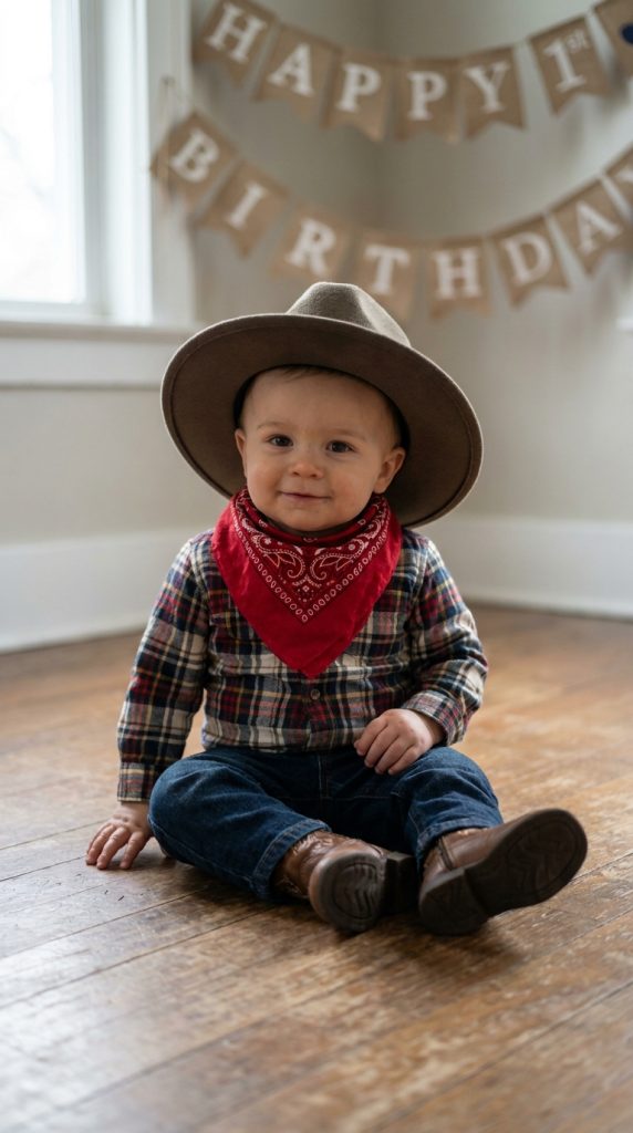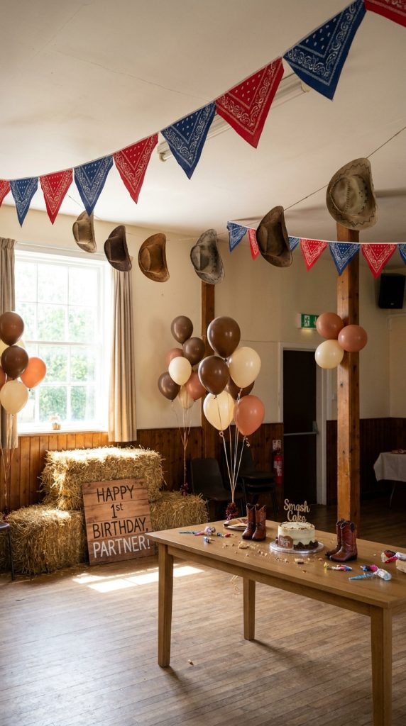 Don’t overlook hay bales — even fake ones — as corner accents. Add a bandana bunting, some wooden signs with phrases like “Yee-Haw,” and a few lanterns. Suddenly, your living room feels like an open range. Small details do the heavy lifting here. Classic rustic cowboy themes pair these same elements — bandanas, hay bales, and western accents — into a cohesive look that works especially well for a first birthday celebration.