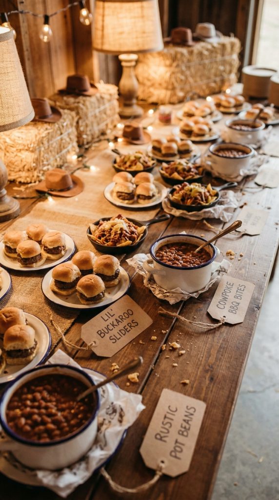 Food is where a western party really comes alive, and the good news is that cowboy cuisine is crowd-pleasing by nature. Set up a snack station loaded with trail mix, mini corn dogs, BBQ sliders, and baked beans in cast-iron skillets. These options satisfy both hungry toddlers and adults who’ve been wrangling kids all afternoon.