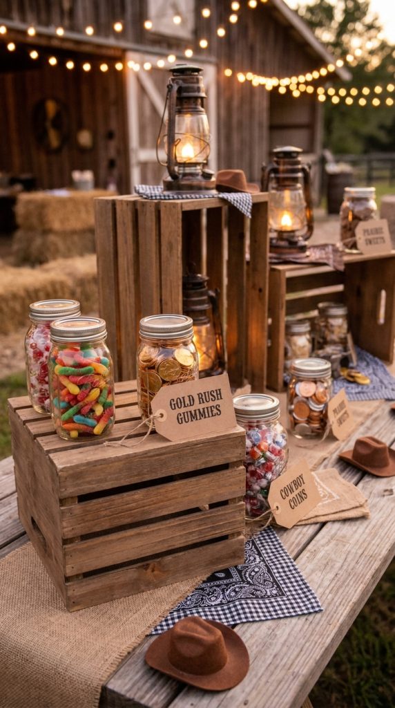 Your candy bar setup deserves its own moment. Fill mason jars with gold nugget gummies, root beer barrels, and chocolate coins. Add small scoops and kraft paper bags so guests can serve themselves. Keep colors earthy — think brown, tan, red, and denim blue — for a cohesive Western feel.