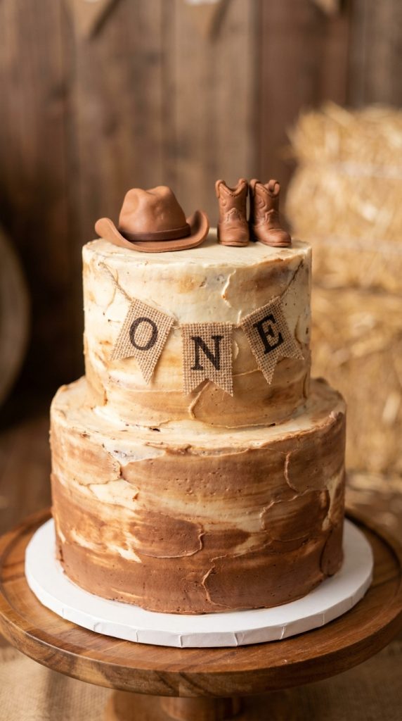 For the design, ask your baker about frosting techniques like textured buttercream ruffles that mimic leather or rustic wood grain effects. Top it with a fondant cowboy hat, boots, or a little “1” sheriff’s badge. Keep the colors warm — think tan, brown, rust, and navy.