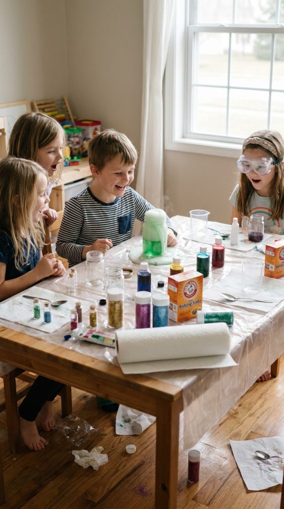 Set up bubbling cauldrons using baking soda, vinegar, and food coloring for safe, dramatic reactions that’ll have kids shrieking with delight.