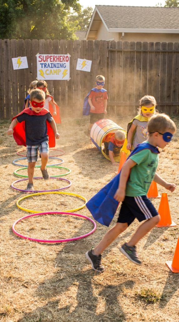 Add a cape-decorating station where little heroes personalize their gear before training begins. It’s active, it’s competitive in the best way, and it keeps every kid genuinely engaged from start to finish.