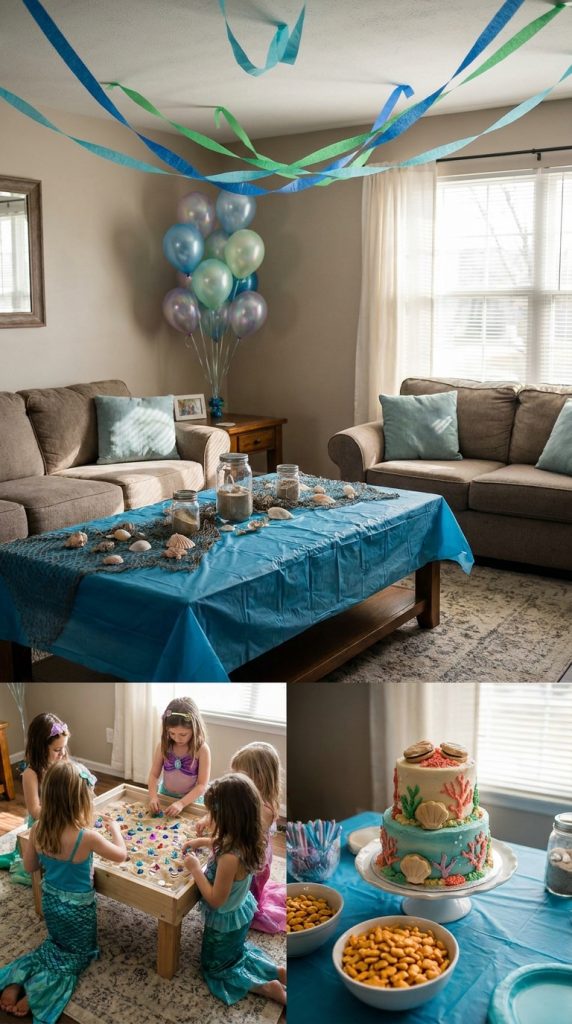 Revamp your space with flowing blue and green streamers, scattered seashells, and iridescent balloons that mimic bubbles rising from the deep.