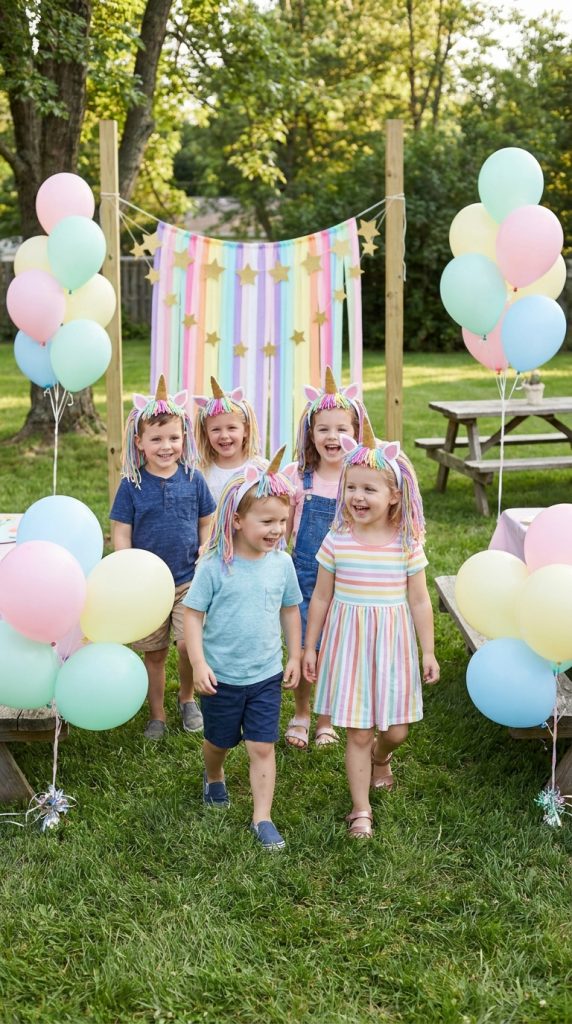 Unicorns have this incredible superpower — they make five-year-olds feel like they’ve stepped straight into a fairy tale. You can lean hard into that magic by organizing a unicorn parade through your backyard, complete with sparkly horns and flowing manes for every child.