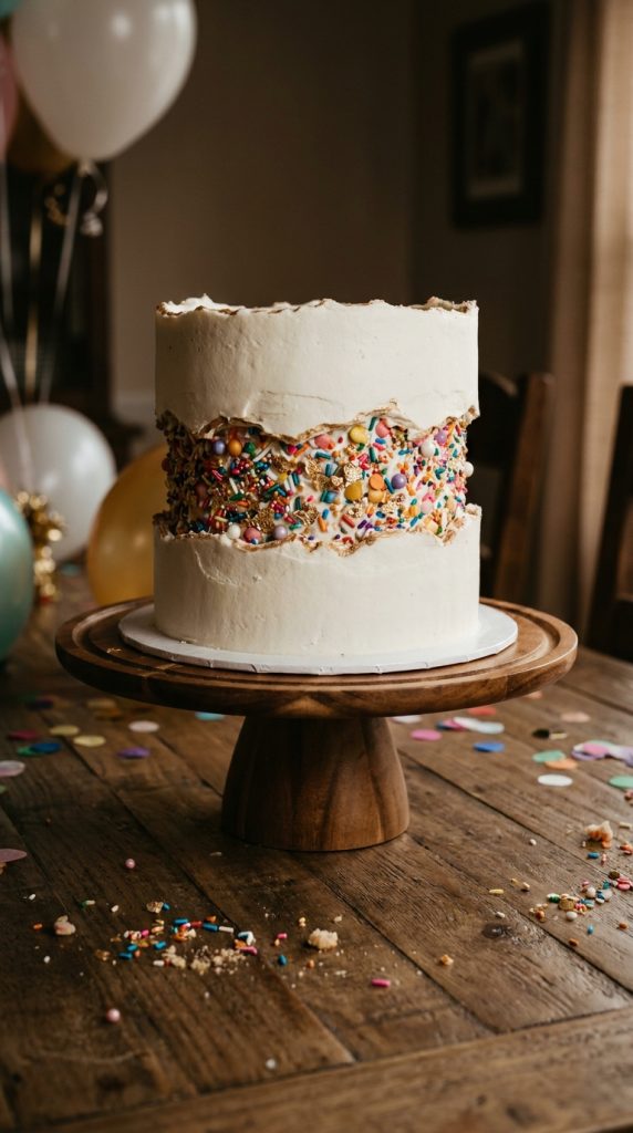 That “break” in the frosting isn’t accidental — it’s a carefully designed concealed cavity that hides sprinkles, candy, or edible flowers bursting outward.