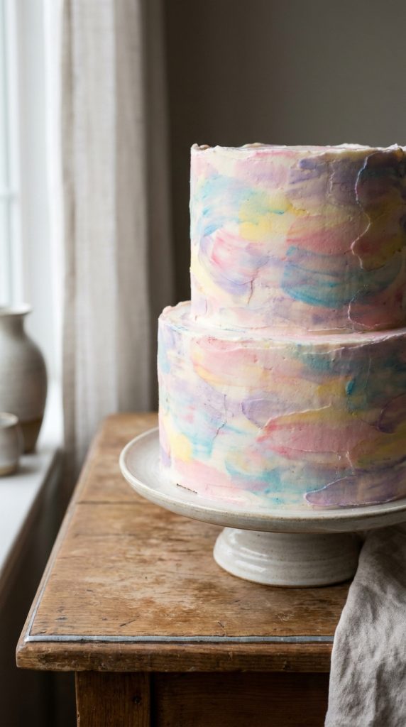 Watercolor buttercream cakes look hand-painted because they actually are — your decorator uses a palette knife or soft brush to blend pastel shades directly onto the frosting in loose, sweeping strokes. The result is pure painted elegance that feels like edible fine art.