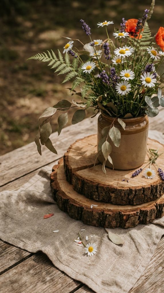 Think wooden accents like rustic log slices or reclaimed wood boxes as bases for your floral arrangements.