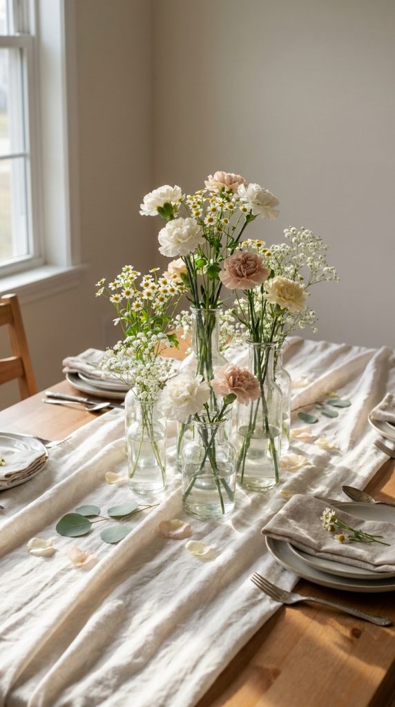 Stack varying-height vases, then fill them with your floral arrangement using budget blooms like carnations, baby’s breath, and grocery store daisies.