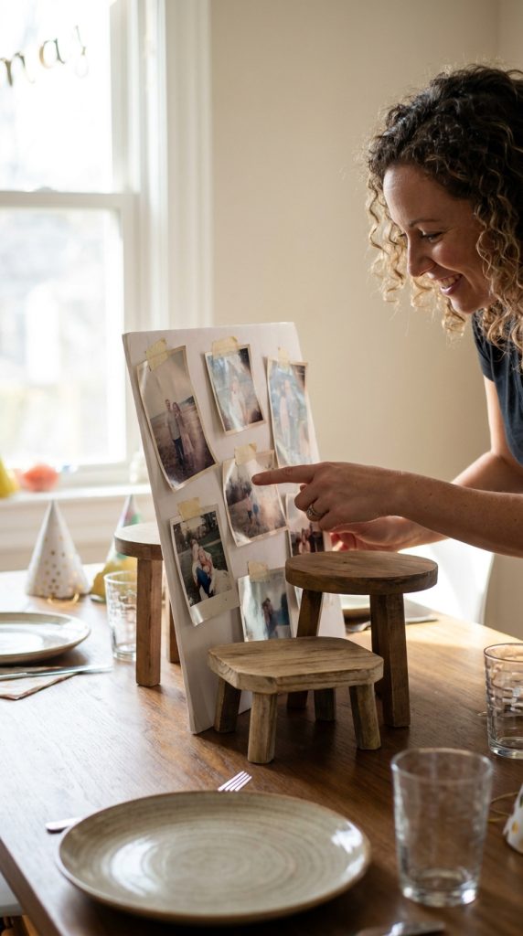 Print photos from different years, arrange them on foam boards or acrylic stands, and cluster them at varying heights using risers.
