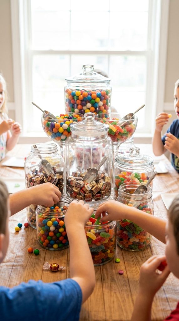 Fill tall apothecary jars with colorful gumballs, wrapped caramels, or themed chocolates that match your party colors.