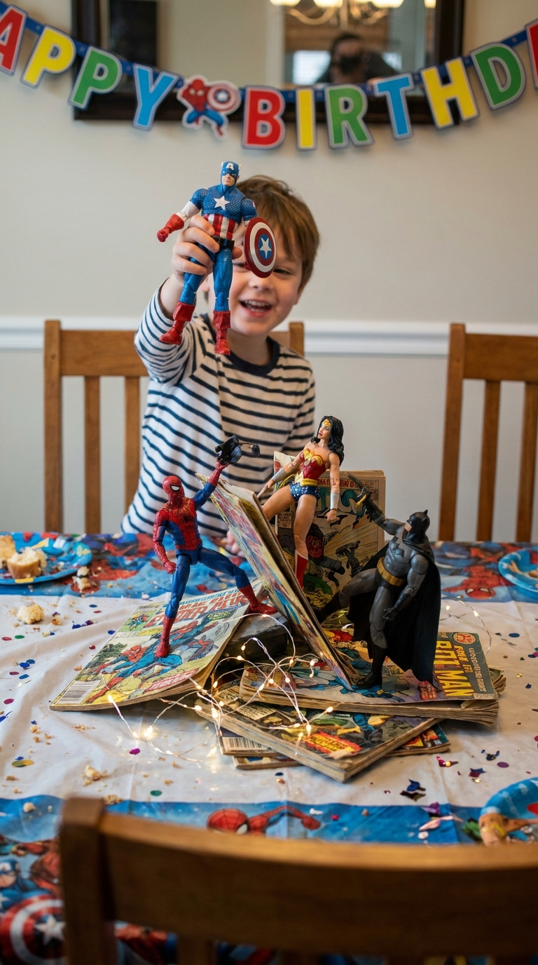 Grab a few action figures and arrange them on colorful play mats to create an instant battle scene centerpiece. Stack comic books underneath to add height and visual drama.