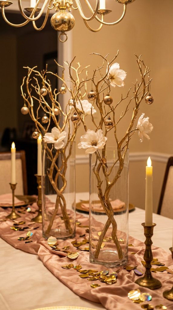 Gold centerpieces have a way of making any birthday table look like it belongs in a magazine spread. You don’t need a massive budget to pull this off, either. Start with tall glass vases filled with gold-painted branches or metallic decor like gilded feathers and mirrored orbs.
