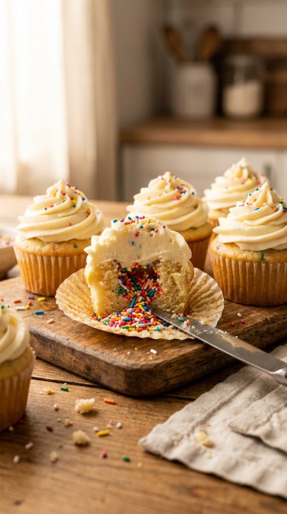 Top each cupcake with sprinkled confetti to mimic that celebratory shower effect. It’s a small detail that makes a massive visual difference.
