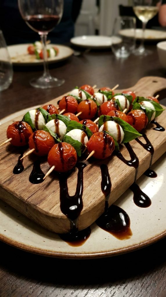 Then drizzle a thick balsamic glaze reduction over everything — it pools like dark, dramatic “blood” across the plate.