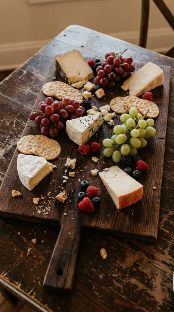 Start with a Gothic cheese platter featuring dark purple grapes, aged black wax cheddar, and charcoal crackers.