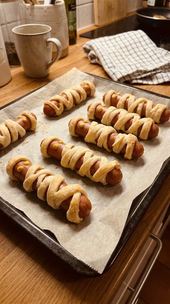 Hot dogs wrapped in crescent roll dough are one of those party foods that take almost no effort but somehow steal the whole show. The mummy wrapping technique is simple: slice the dough into thin strips and wind them around each hot dog, leaving a small gap for the “face.” Bake until golden, then add mustard or candy eyes. You’ve got adorable little mummies in under 30 minutes.