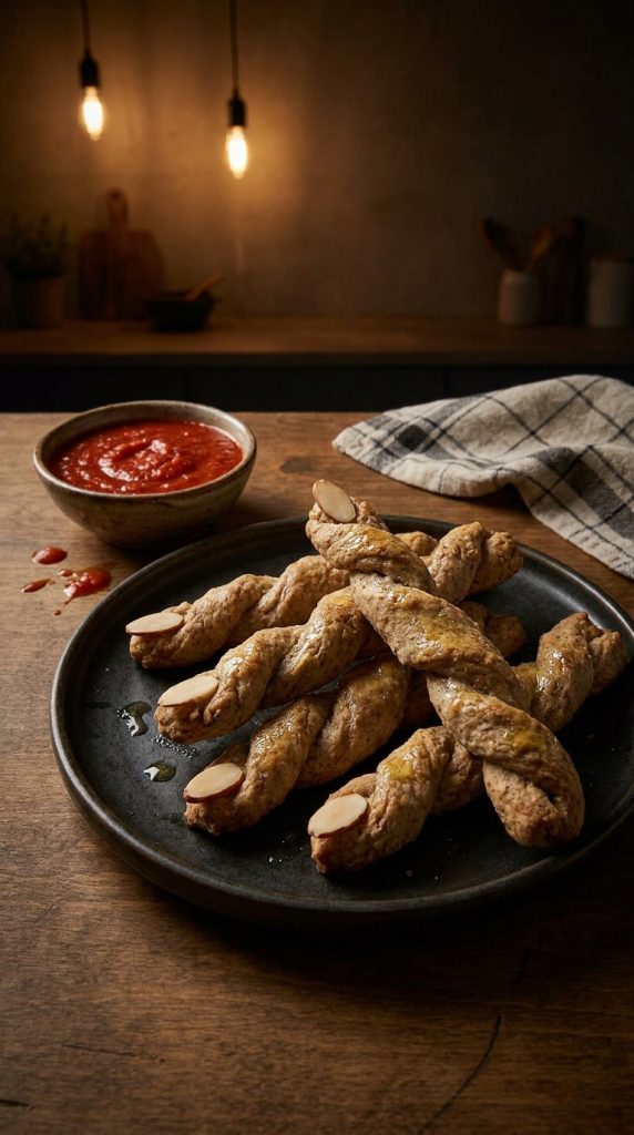 These creepy little breadsticks are the savory MVP of any Halloween party spread. You’ll shape homemade breadsticks into long, gnarled finger shapes, then press a sliced almond onto each tip for a realistic fingernail effect. Trust me, guests will do a double-take before grabbing one.