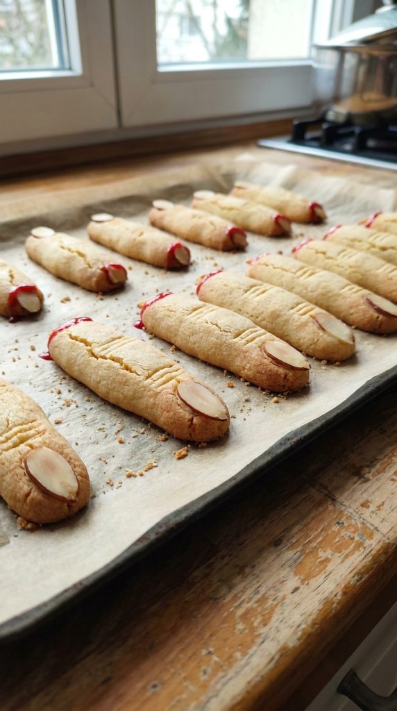 These cookies are the kind of treat that makes guests do a double-take before reaching for one. Shape your shortbread dough into realistic finger shapes, then press an almond into one end for the nail. Bake until golden, then paint cursed sugar glaze over each finger for that eerie, otherworldly shine.